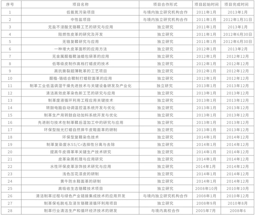 “系统化皮革清洁生产技术”项目被科学技术部星火计划办公室列为*********星火计划项目,“循环经济型制革清洁生产技术的研发”项目荣获首届“中国皮革行业节能减排环保创新奖”三等奖。